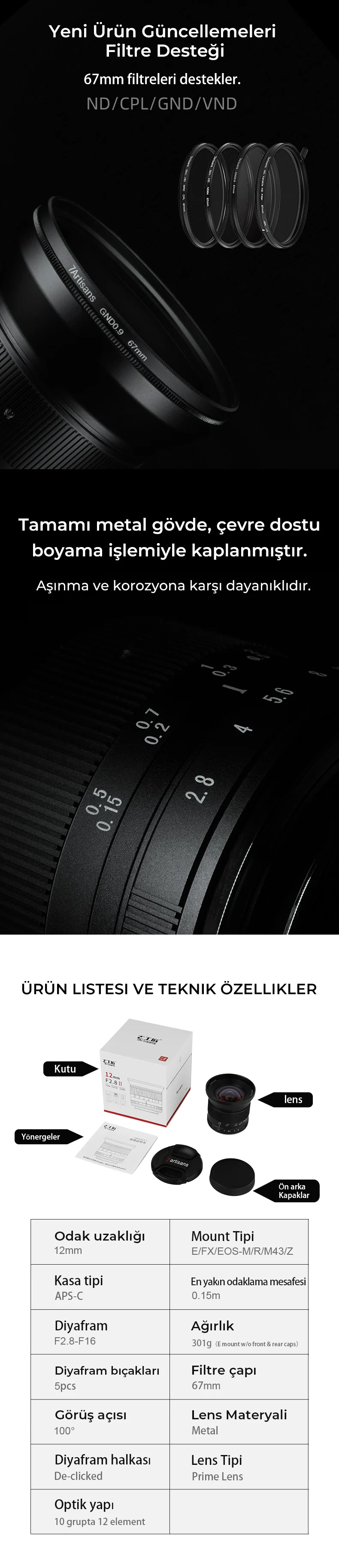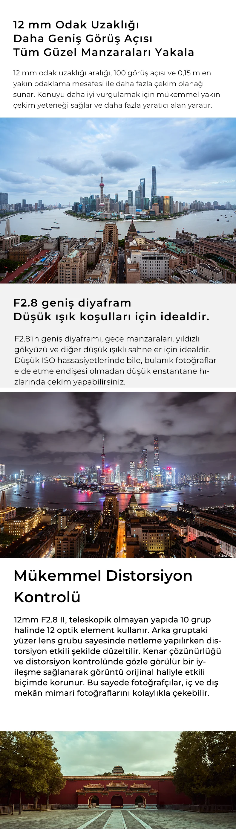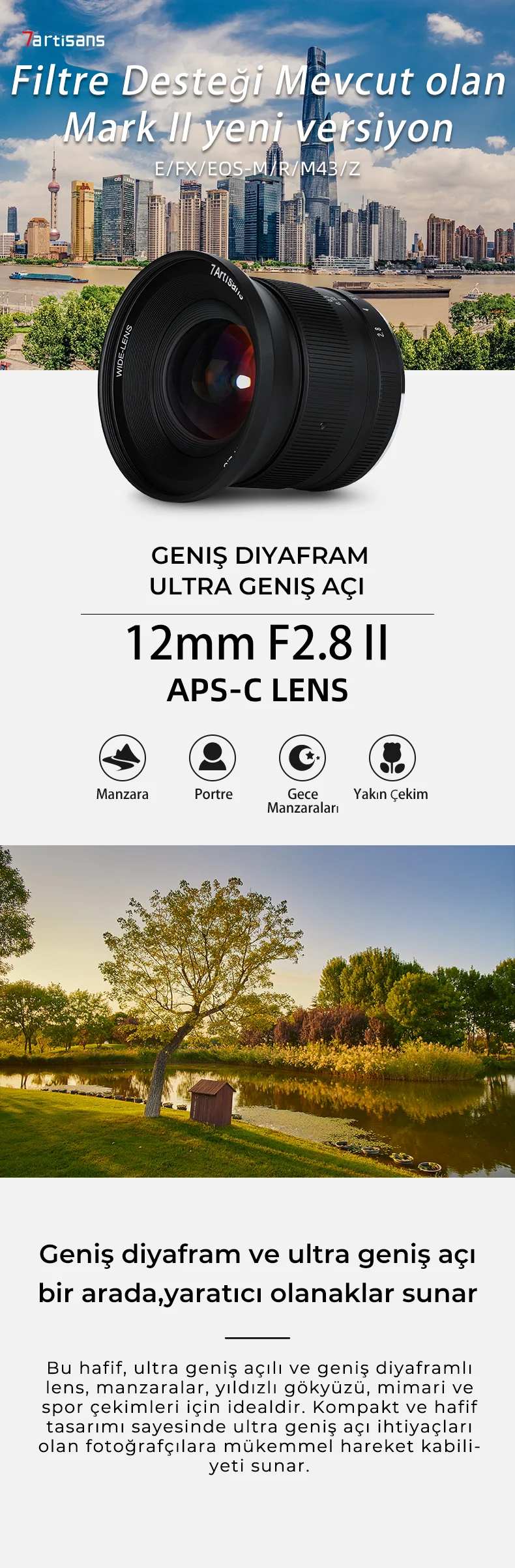 Aynasız kameralar için kompakt geniş açılı bir prime olan 7artisans Photoelectric'in bu 12mm f/2.8 Mark II Lensi, geniş bir görüş alanı gerektiren manzara, şehir manzarası ve mimari nesneler için çok uygun olan tamamen manuel bir lenstir. Lensin f/2.8 maksimum diyaframı, çeşitli ışık koşullarında çalışmayı kolaylaştırır ve elde çekim için küçük ve hafif form faktörünü korumaya yardımcı olur. Manuel odak tasarımı, ön odaklama ve bölge odaklama tekniklerini kullanmak için hem alan derinliği hem de mesafe ölçekleriyle tamamlanır. Ek olarak, lens 7,9" kadar yakın nesnelerle çalışmaya izin verir.